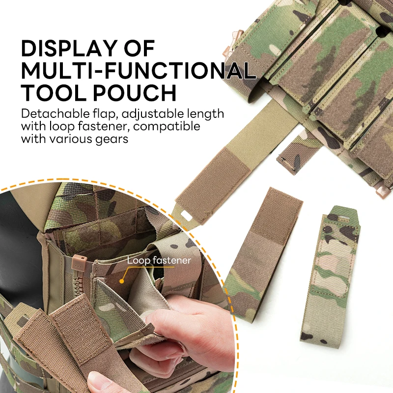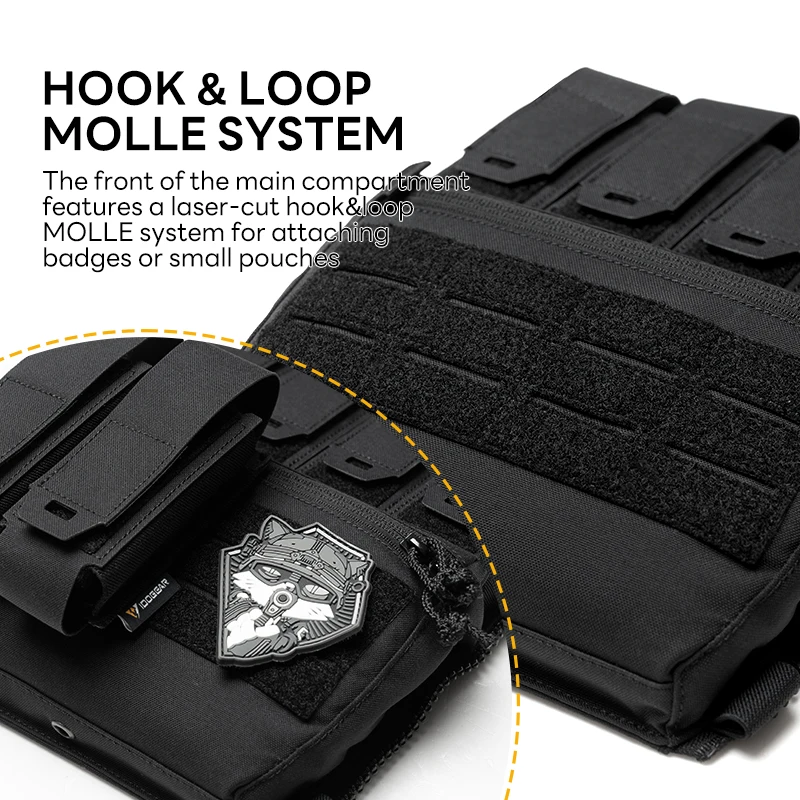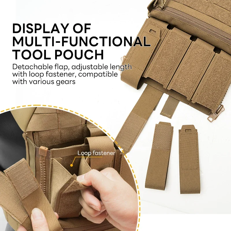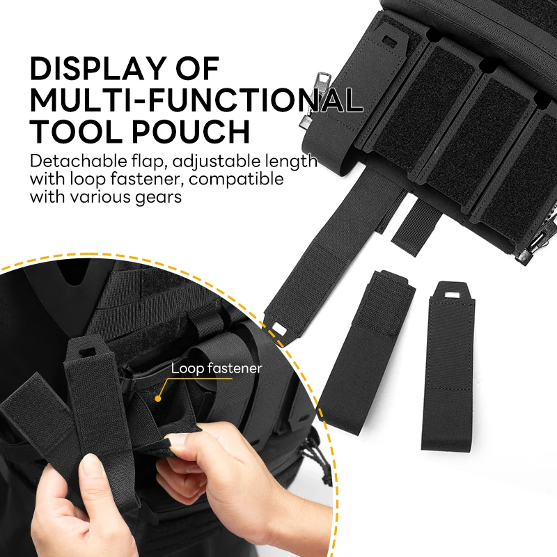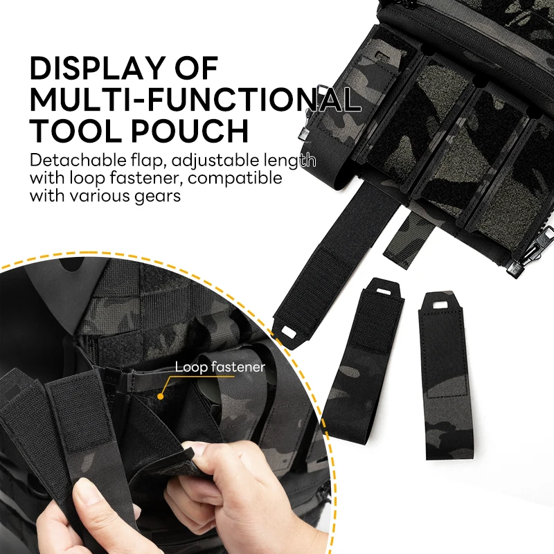 • 4 poches extensibles multi-ajustements sur le dessus et une poche GP en bas, convient aux articles comme les flashbangs, les grenades de fumée, les 56 magazines, les magazines FOG, etc.